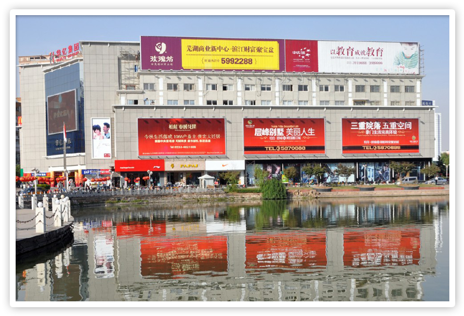 ????????在華億廣場外立面開發三面翻和大牌是偉晨文化開拓廣告業務的主要方式,目前分別在步行街華億廣場及北京東路華億廣場共外立面建有18塊三面翻和11塊大牌,廣告位總面積達到11000㎡,是蕪湖市城區內最大的戶外媒體資源商。我司廣告位自2007年銷售以來,客戶幾乎涵蓋蕪湖市內所有的金融、通信、各大房地產商以及汽車銷售企業,是各大商家及企業首選的戶外媒體。
